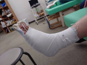 「そのまま病院へ」ではなく、まずは当院でL字シーネを作成し、痛みを抑えつつ荷重(体重をかけること)ができる状態に整えました。 本来であればシリンダーギプスによる強固な固定が理想的ですが、病院でのレントゲン検査をスムーズに受けていただくため、今回は取り外しや診察がしやすいシーネを選択しています。